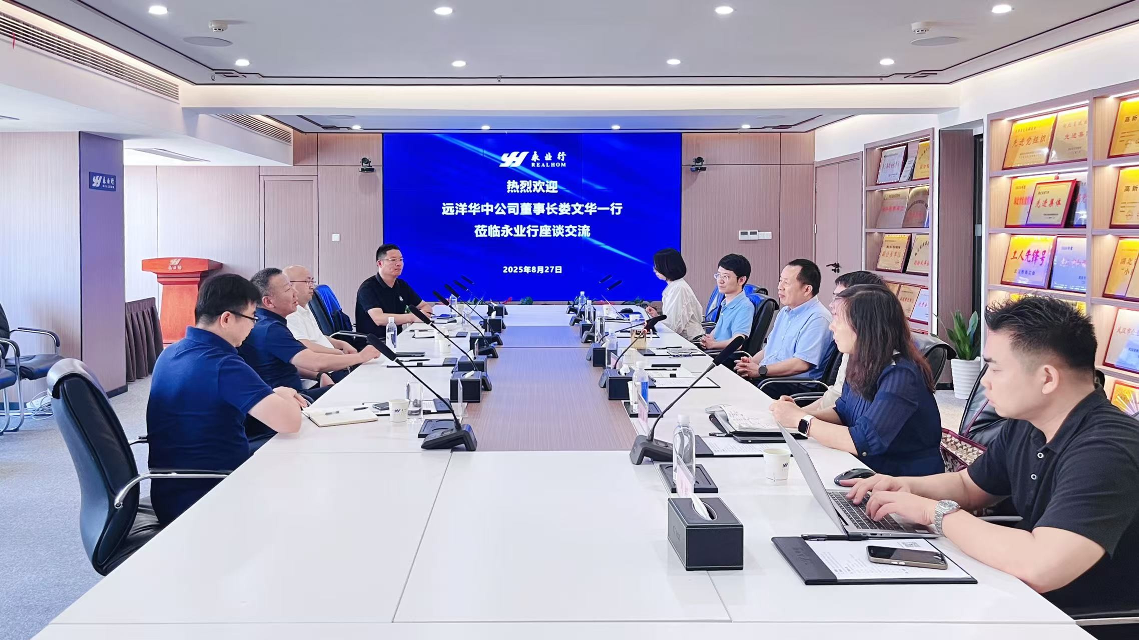 远洋华中公司娄文华董事长一行莅临永业行座谈交流 2025-08-28 8月27日,远洋华中公司董事长、总经理娄文华一行莅临永业行,就新形势下的城市更新业务开展交流。永业行董事长潘世炳、常务副总裁文云波等热情接待并参加座谈交流。 娄文华对永业行在城市更新及房地产新模式领域展现的政策研究、项目谋划、资金争取、创新案例等方面的专业能力表示高度赞赏,详细介绍了远洋华中公司的业务发展现状,并围绕城市更新项目谋划、资金争取、建设运营等进行了深入探讨。他表示,双方将进一步深化合作关系,充分整合各自资源禀赋与核心优势,在城市更新、房地产新模式等领域进一步深化与永业行的合作,实现协同发展与成果共赢。 潘世炳对娄文华一行的到访致以热烈欢迎,全面介 MORE