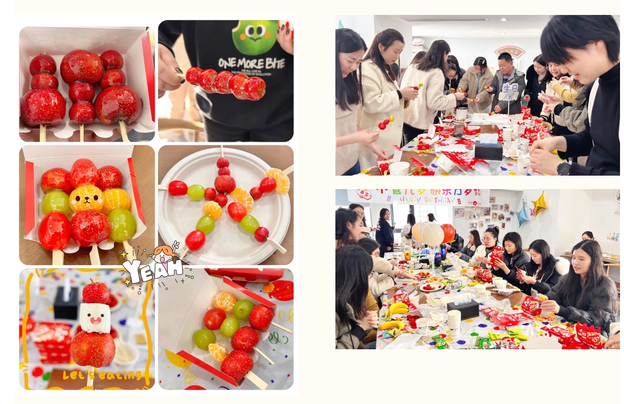 生日会活动后,四季度寿星们在员工餐厅参加了冰糖葫芦DIY活动,现场准备了多种水果: